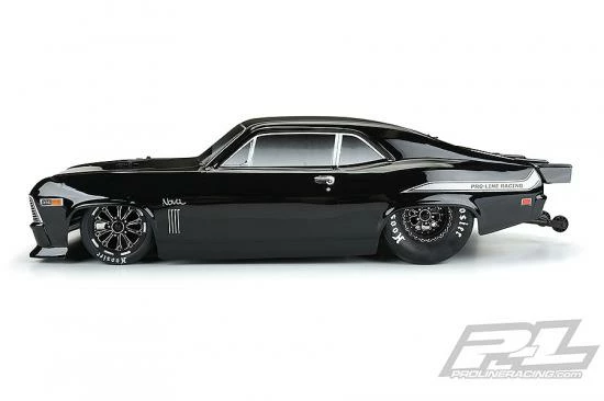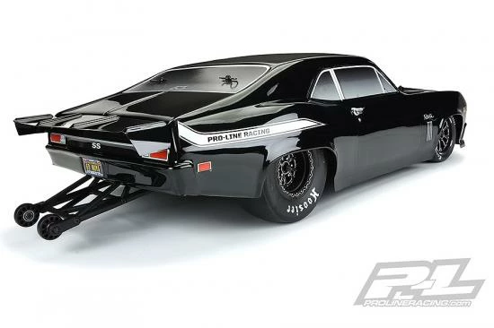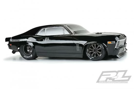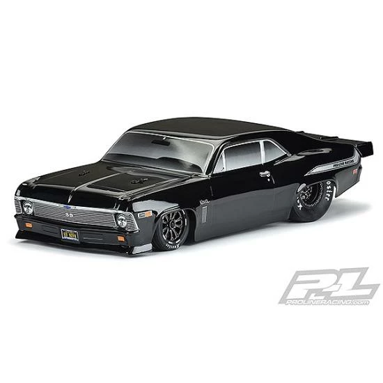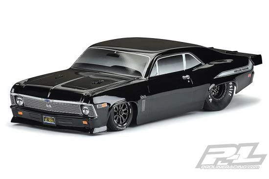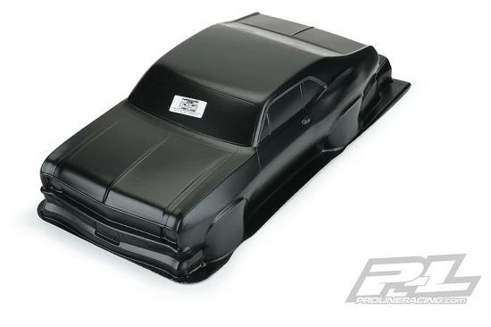 This is a 1969 Chevrolet® Nova™ Drag Car Tough-Color Black body. Pro-Line is proud to introduce the iconic 1969 Chevrolet® Nova™ Tough-Color Black body specifically designed for the growing Racing scene! This body is perfect for No-Prep Drag Racing and features an ultra-realistic one-piece body design and includes an optional add on spoiler to complete the drag racing look. No more messing with separate nose pieces to achieve scale front end detail! The Nova™ is now available in completely black polycarbonate Tough-Color material, so you never have to worry about paint peeling or chipping off. Realistic window stickers are also included!