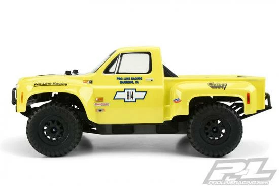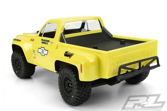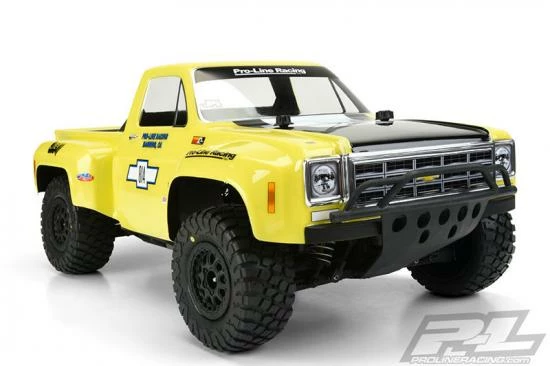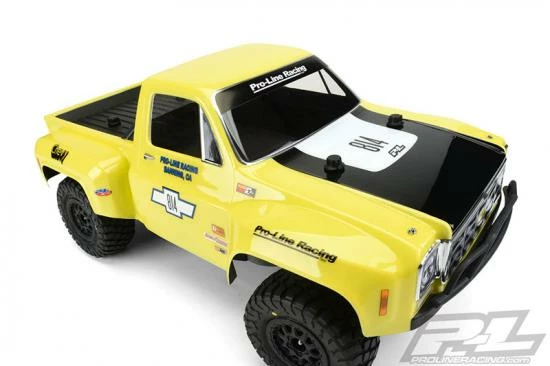 This is a 1978 Chevy® C-10„¢ Race Truck Clear Body for Short Course. Pro-Line now has the ultimate licensed Chevy® body – the 1978 Chevy® C-10„¢ Race Truck! This step-side classic truck body features large, full race fenders and styling that will separate your truck from the rest. This well-known and recognizable truck body style won many desert races in the mid to late 70’s and was driven by off-road legends Parnelli Jones, Rick Mears and Walker Evans making it the ultimate dream truck to many race fans. The body includes fully licensed Chevy® grill, headlight and taillight decals to complete the look. Give your Short Course Truck the tough look it deserves with Pro-Line’s new Chevy® C-10„¢ body!