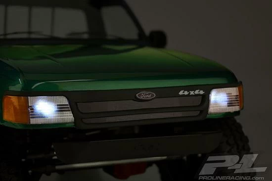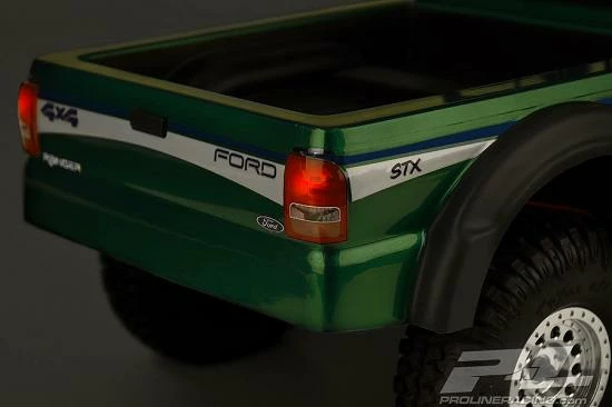 Included with this body are a molded black plastic front grill and rear taillight buckets with clear headlight and taillight lenses that allow for the addition of working 5mm LED lights (PRO631700) and 3mm LED turn signals (sold separately). Also included are molded plastic side-view mirrors and door handles that are scale replicas of the full-size parts off the 1993 Ford® Ranger. The Cab and Bed are separate pieces for added scale realism and are made from crystal-clear polycarbonate that can be painted to match your favorite factory Ranger color or custom painted to whatever your heart desires.