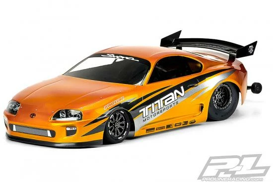 This is a 1995 Toyota Supra Clear Body for Drag Racing. Is that a Supra?! Yes, it really is! Pro-Line is proud to introduce the car culture phenomenon 1995 Toyota Supra clear body to the no prep drag racing scene. All the iconic rounded shapes of the full-size car have faithfully recreated in 1/10 scale size and tuned specifically for drag racing. Pro-Line even includes separate headlight buckets to accurately replicate the 3-dimensional depth of the 1995 Supra headlights. The body features a unique tuner-style raised rear wing that is lifted by the included molded black plastic wing struts to complete the iconic Supra styling. Or you can 3D print your own OEM style Supra Spoiler using the design file provided by Pro-Line at the link below. Get your own 1995 Toyota Supra Clear Body for Drag Racing today!
