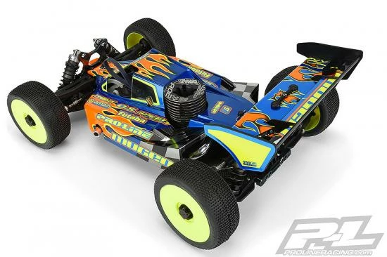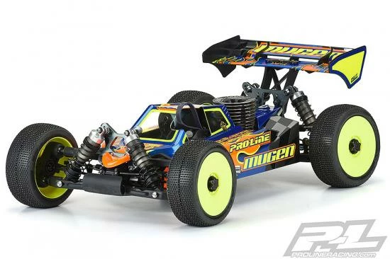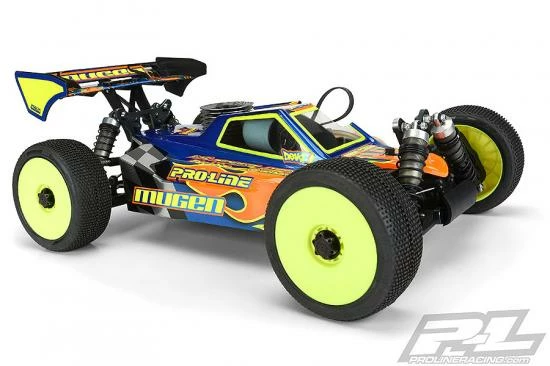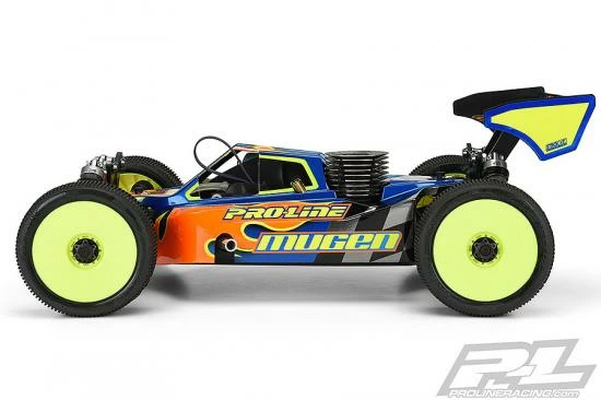 Introducing the all-new Axis race body for the 1:8 scale Mugen MBX8 Nitro, and MBX8 Eco buggies. A clean-sheet design from Pro-Line brings a fresh new look to the class. Designed with the latest in CAD technology, the Axis features a super low-slung design with sharp lines throughout giving it an unmistakable look on the track. The Axis is a cab-forward design that provides enhanced steering response while the small side fins balance out the rear of the car with ideal side-bite. The rear of the Axis body has the right amount of clearance for the nitro engine and fits the chassis and bulkhead shape of your race buggy perfectly. To run the Axis body on the MBX8 Eco electric buggy, the battery must be no taller than 39mm due to the low-slung nature of the Axis side pods.