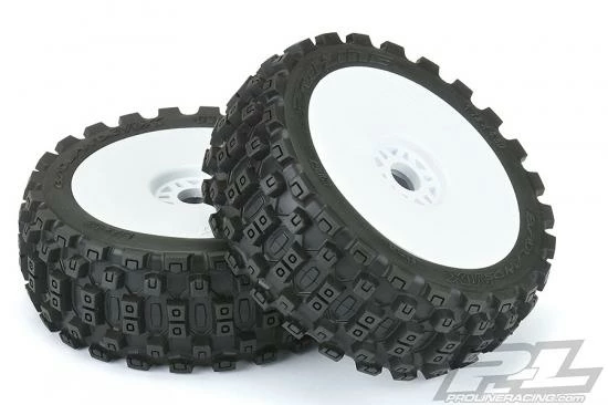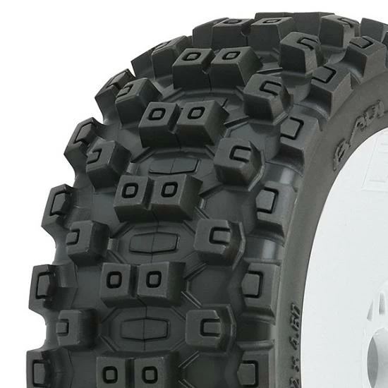 This is a pair of Pre-Mounted Badlands MX Tires for 1:8 Buggy. Pro-Line is taking the 1:8 Buggy tire game to the next level with the Biggest and Baddest tire ever conceived: the Pre-Mounted Badlands MX! Pro-Line Badlands tires are known for having sweet Motocross inspired tread and the all-new Badlands MX tires kick that up a notch with a Bigger and Bolder knobby tread that matches modern MX tire design. The Badlands MX is a true All-Terrain tire that will find traction on any surface but is best suited for loose & loamy dirt, mud or grass. Just imagine your buggy throwing up huge rooster tails with these awesome looking tires!