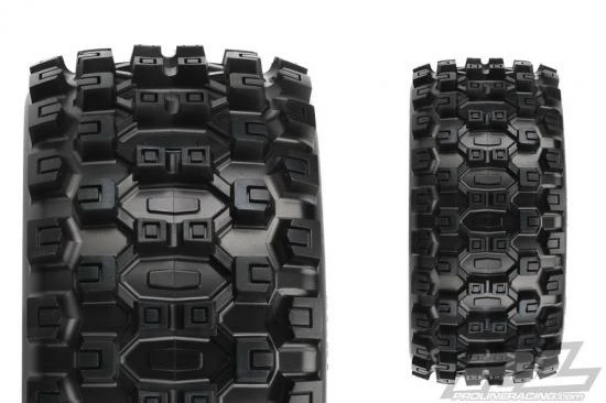 This is a pair of pre-mounted Badlands MX43 tires for X-MAXX®. Pro-Line is ready to unleash the long-awaited tire solution for X-MAXX® owners with the Biggest and Baddest tire and wheel combo ever conceived: the Badlands MX43 mounted on Impulse Wheels! Pro-Line Badlands tires are known for having a sweet Motocross inspired tread and the all-new Badlands MX43 tires kick that up a notch with a Bigger and Bolder knobby tread that matches modern MX tire design. These tires have been developed from the ground up for extreme X-MAXX® punishment with an all-new ultra-durable compound that prevents tire ballooning even at high speeds. The Badlands MX43 features Pro-Line’s ground breaking proprietary Pro-Loc Technology that creates an ultra-secure bond to Pro-Line’s Impulse Pro-Loc X-MAXX® wheels while still being removable when required. The Badlands MX43 is a true All-Terrain tire that will find traction on any surface but is best suited for loose & loamy dirt, mud or grass. Just imagine your X-MAXX® throwing up huge rooster tails with these aggressive looking tires!