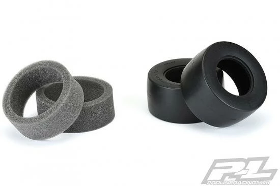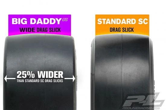 This is a pair of Big Daddy Wide Drag Slick SC Rear Tires. Are you searching for more grip off the line for your No Prep Drag Car? Is your car begging for wide drag slick rear tires to complete the authentic look of your build? Look no further than Pro-Line’s all-new Big Daddy Wide Drag Slick SC tires! The Big Daddy tire has a massive 2″ wide contact patch (25% wider than standard Short Course Drag Slicks) making them ideal for low-grip, no-prep surfaces while still fitting standard Short Course 2.2″/3.0″ wheels. Pro-Line engineers added extra webbing inside of the tire for added stability at the high speeds found in drag racing. The Big Daddy tire is made from Pro-Line’s MC compound which has become a drag racing favorite for its incredible grip on a variety of surfaces and its resistance to stretching. Pro-Line includes soft gray foam inserts to allow the Big Daddy tires to fully conform to the track surface and provide maximum grip. Don’t be left spinning your tires off the line; get yourself a set of Big Daddy Wide Drag Slick Tires now!