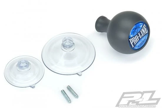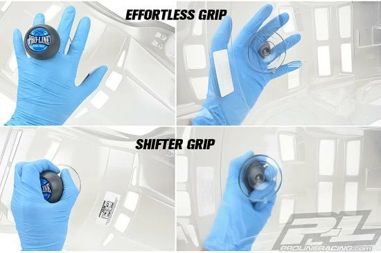 This is a custom machined tool made from Type 1 PVC and turned to match popular grip styles. The Body Grip tool includes 2 suction cups to easily adapt to many body sizes and shapes. The large cup is a 2 1/2″ (60mm) rated to hold 7 lbs and best used on the roof or windshield of larger scale bodies. The medium cup is a 1 7/8″ (45mm) rated to hold 3 lbs and best used on the roof or windshield for small scale bodies or tight areas where the large cup may not fit. To finish it off the Body Grip tool has a stylish Pro-Line “Custom Paint” decal.