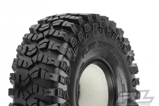This is a pair of 1.9″ Flat Iron XL Tires. The 1.9″ Flat Iron is BACK in Extra Large form to suit your scale rig! The hugely popular 1.9″ Super Swamper XL paved the way for larger 1.9″ scale tires and the new 1.9″ Flat Iron XL follows the “bigger is better” mantra. The beloved Flat Iron tread pattern combines scale realism and all out rock climbing performance that you have come to expect from Pro-Line tires. The large lug pattern combined with siping allows the tire to have the perfect amount of flex under throttle acceleration. In fact, in our testing, the Flat Iron’s response to throttle acceleration was unmatched. The Flat Iron tire is made to climb up anything that you challenge it with.