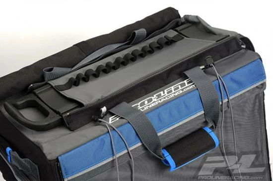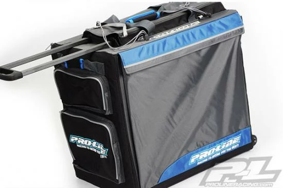 This is a Pro-Line Hauler Bag.  The Pro-Line Hauler Bag is here! Designed with 4 easy access drawer compartments, several zipper pockets and tool storage, the Pro-Line Hauler Bag is perfect for your RC needs. Stylish Pro-Line logos on the front, top and side stand out when arriving at the track and a collapsible pull handle and smooth rolling casters combine to get you organized in the pits. The new Hauler Bag also includes tie-down Bungee straps for securing 1 vehicle (Buggy, SC, Truck, etc.) on top of the Bag for fewer trips between the Track and your vehicle. Get your own Pro-Line Hauler Bag today!