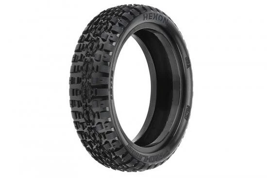 This is a pair of Hexon 2.2″ 2WD Front Carpet Buggy Tires. Introducing the Pro-Line Hexon 2.2″ Carpet 2WD Front race tire! The Hexon front tire features a hexagon pattern of uniquely shaped pins combined with Wedge style outer pins that provide longer-lasting tread and more consistent performance than previous generations of carpet tires. The Hexon front features a low-profile tire carcass shape that lowers your car’s center of gravity for improved corner speed due to consistent sidewall flex. The Hexon pins are pointed front to back for maximum control in the corners providing the direct feel carpet racers crave. The Hexon front tire is another leap forward in the hot carpet racing scene; be the first with the fastest carpet tire yet – Pro-Line’s Hexon Front!