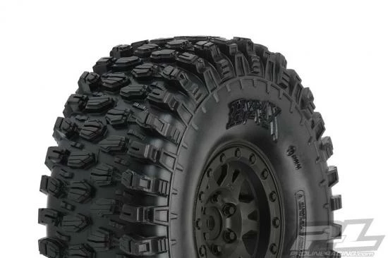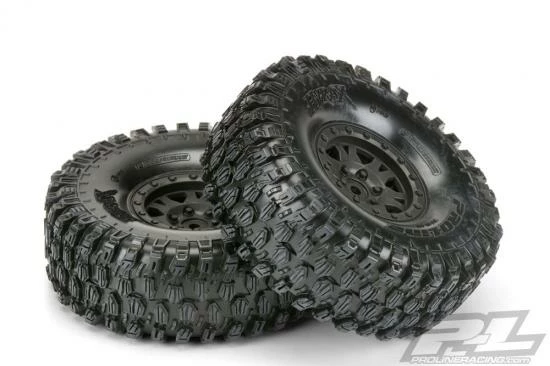 This is a pair of pre-mounted Hyrax 1.9″ Tires. The future of 1.9″ Tire Performance has arrived with Pro-Line’s all-new Hyrax Tire! Designed from the ground up for maximum grip on the toughest terrain, the Hyrax tire is ready for anything your Scale Adventure might throw at you. The Hyrax features an aggressive and open tread pattern with each tread block containing multiple Sipes for incredible tread flex. The highly detailed connected tread on the sidewall of the Hyrax extends out for unmatched side-hilling performance. The Hyrax also features futuristic stepped tread blocks that create even more forward gripping edges that dig into slick rock like no other scale tire Pro-Line has produced to date! The Hyrax is made from Pro-Line’s Legendary G8 material, so you know it provides performance you can depend on.
