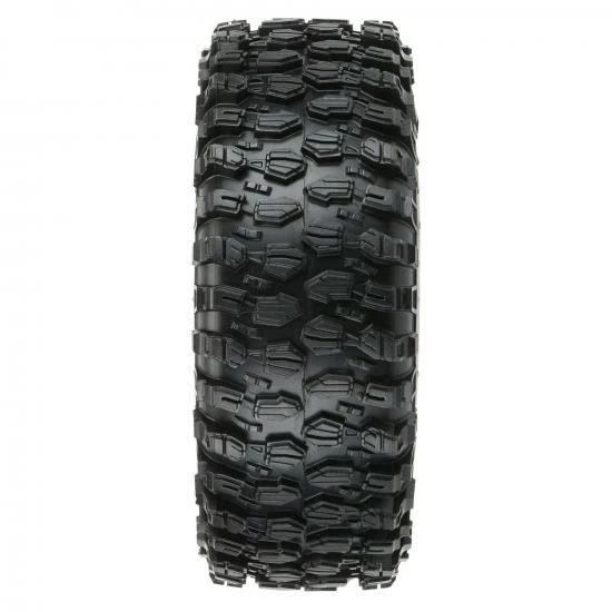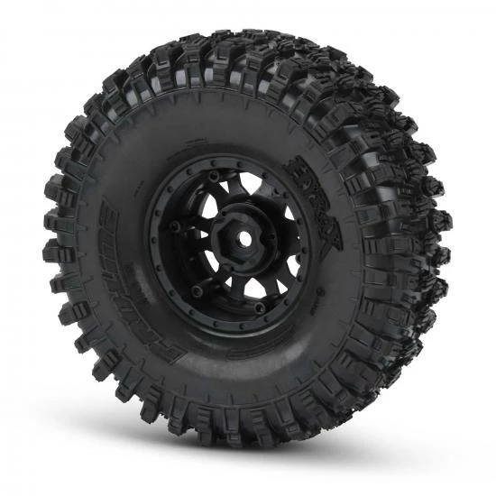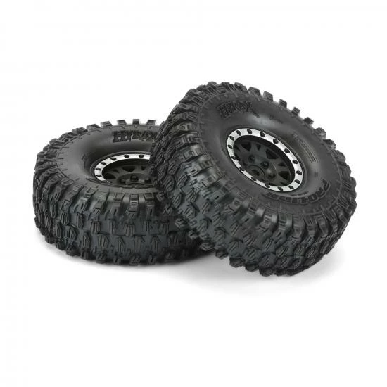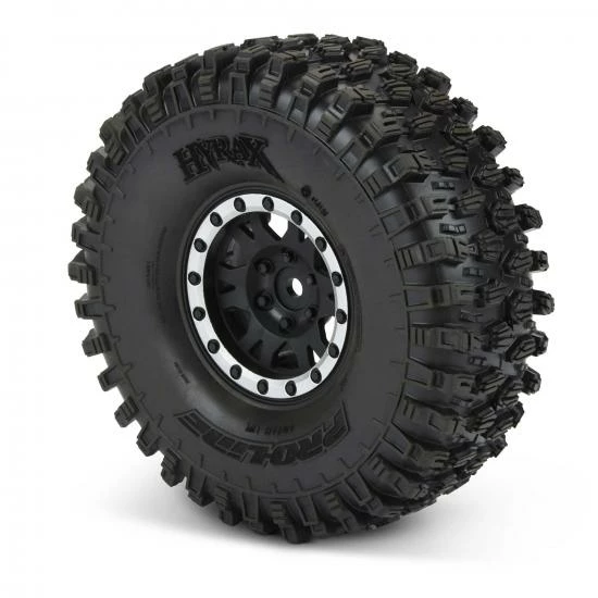 The future of 1.9″ Tire Performance has arrived with Pro-Line’s Hyrax 1.9″ Predator Tire mounted to Impulse Black/Silver Wheels! Designed for maximum grip on the toughest terrain, the Hyrax tire is ready for anything your Scale Adventure might throw at you. The Hyrax features an aggressive and open tread pattern with each tread block containing multiple sipes for incredible tread flex. The highly detailed connected tread on the sidewall of the Hyrax extends out for unmatched side-hilling performance. The Hyrax also features futuristic stepped tread blocks that create even more forward gripping edges that dig into slick rock like no other scale tire Pro-Line has produced to date! The Hyrax is made from Pro-Line’s Super Soft Predator material, so you know it provides the maximum performance possible.