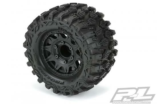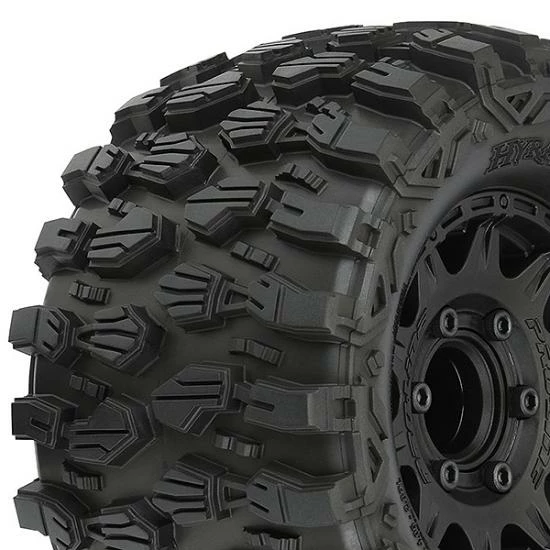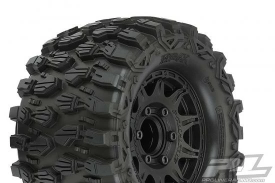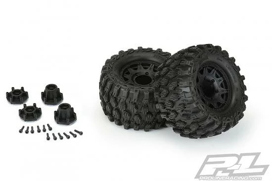 This is a pair of pre-mounted Hyrax 2.8″ Tires on Raid Removable Hex Wheels. Pro-Line is very excited to announce the Hyrax 2.8″ tire pre-mounted to the Raid Black 6×30 Removable Hex wheel! We take the guesswork out of your glue job by doing the mounting for you so you can spend more time having fun!