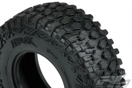 This is a pair of Hyrax SCXL All Terrain Tires. The future of Desert Truck and oversized SC Tire Performance has arrived with Pro-Line’s Hyrax SCXL Tire! Designed from the ground up for incredible grip and stability on the toughest terrain, the Hyrax tire is ready to tackle anything your Desert Truck or modified Short Course Truck can dish out. The Hyrax features an aggressive open tread pattern with each tread block containing multiple sipes for improved forward grip. The highly detailed connected tread on the sidewall of the Hyrax extends out for added scale realism and sidewall rigidity to prevent traction rolls. The SCXL is over ¼” taller than a standard Short Course tire for increased ground clearance and improved handling on rough terrain and is the perfect size for many solid-axle Desert Trucks. The Hyrax is made from Pro-Line’s legendary M2 compound, so you know it provides the performance and durability that you can depend on. Don’t get left behind, take your adventure to the next level with Pro-Line’s Hyrax SCXL tires!