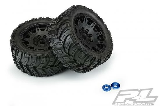 The Raid 5.7″ Black Wheel features a 24mm hex with the standard 1/5 scale through-hole to fit most 1/5 scale vehicles and includes machined aluminum wheel washers to fit onto the popular X-MAXX® platform. Inspired by popular full-size off-road wheels, the Raid 5.7″ wheel is extremely tough and has the bold style to match. The low-profile Masher X HP tires are glued to the big diameter Raid wheel for the ultimate in lightweight, all-terrain performance. The Masher X HP tires are made for unmatched grip on the dirt, street, grass, and gravel. This tire and wheel package is proudly manufactured at Pro-Line Headquarters in the USA! If you are ready to take your X-MAXX® and KRATONâ„¢ 8S to the next level of Performance and Durability, then you need Pro-Line’s new Masher X HP BELTED Tires mounted to Raid 5.7″ Wheels!