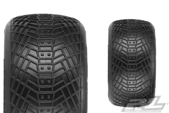 This is a pair of Positron Stadium Truck Tires. The future of Stadium Truck Tire Performance is here with Pro-Line’s all-new Positron T Tire! Designed from the ground up with a futuristic directional tread design, the Positron delivers true next generation performance with improved grip and corner speed on indoor clay tracks. The tread design pays homage to the Electron and ION tire before it with the 2 center pins boxed in by connected bars for a familiar Pro-Line signature look. From there the connected bars shoot off at angles that have been specifically designed to provide maximum Forward Bite combined with unmatched corner speed all while lasting longer than the competition. The Positron is directional, which adds another tuning option for the racers always looking for that extra edge since it will perform differently depending on which direction it is run. Get the newest and best race tire for your Stadium Truck – the Pro-Line Positron!
