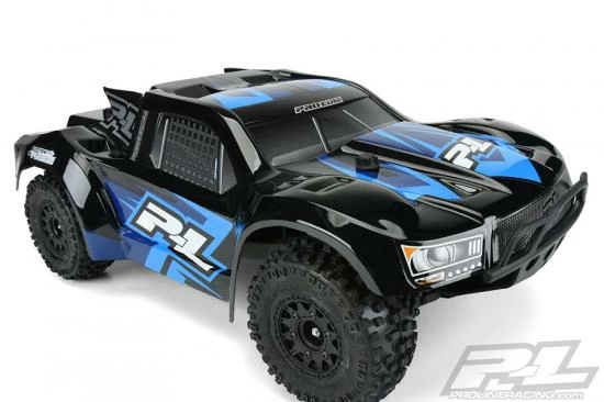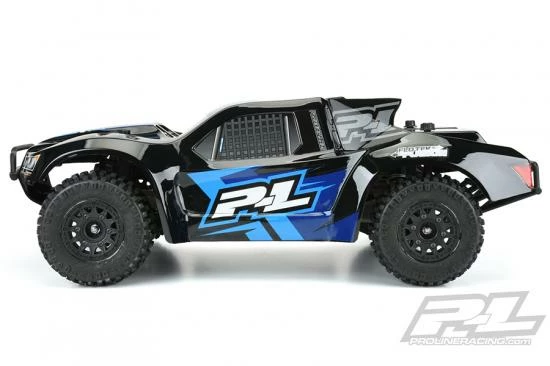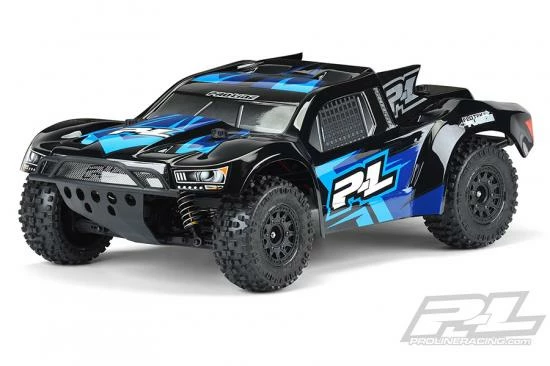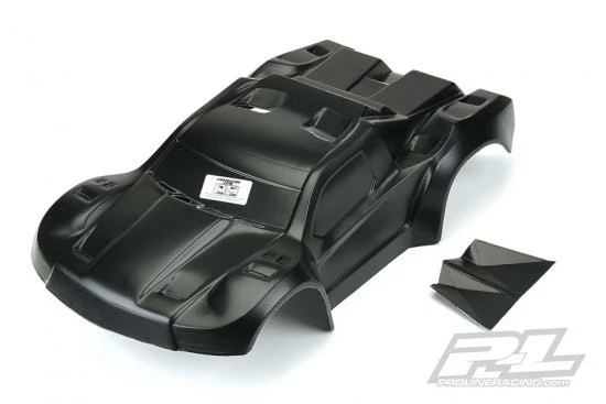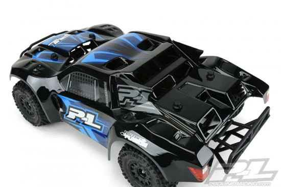 This is a Pre-Painted / Pre-Cut Flo-Tek Fusion Black SC Body. Pro-Line is proud to release the Flo-Tek Fusion body completely Pre-Painted black with detailed wrap decals and Pre-Cut to get you going even faster! Just install your decals and put in your body post holes and go! The Fusion wrap decals are pre-cut and feature Pro-Line Blue speed lines that will make your truck stand out from the rest. The polycarbonate is made from black material, so you never have to worry about paint peeling or chipping off. Realistic window stickers are also included!