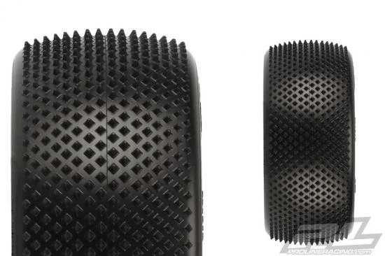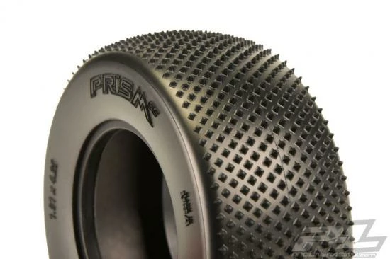 This is a pair of Prism SC Rear Tires. Pro-Line is ready to bring the popular Prism tread pattern to the Short Course class! The Prism features a bunch of Ultra-Sharp Prism shaped Pins laid out in a unique pattern that grip the carpet better than Velcro®. The pins on the Prism are slightly smaller than the original Pin Point rear tire but there are many more of them, which results in faster and more consistent lap times. The Prism has been positioned with the knife edge pointed front to back and side to side for maximum grip and to stay sharp even as they wear down. The Prism tire is destined to change the carpet racing scene; be the first one with the fastest carpet tire yet – Pro-Line’s Prism!
