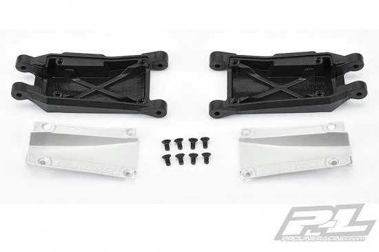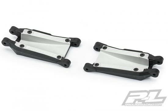 This is the PRO-Arms Rear Arm Kit for Slash® 2wd. Pro-Line is tremendously proud to introduce the new PRO-Series performance upgrade parts that are proudly Made by Us in the USA starting with the PRO-Arms for your lash® 2wd! The PRO-Arms Front Arm Kit includes cutting edge race-style Black arms with smooth bottoms that are capped off with Stone Gray stiffening plates resulting in extremely durable arms. The Arm plates are held on by multiple Flat Head screws and the Stone-Gray color can be dyed or painted to match your truck’s style!