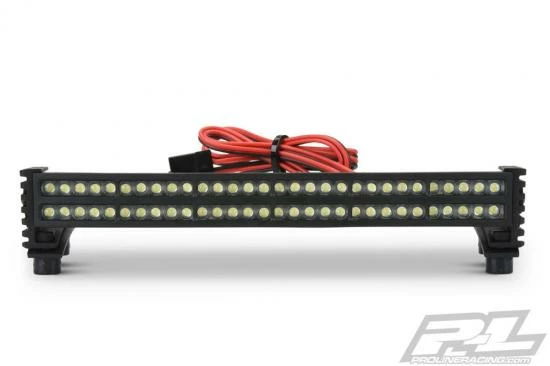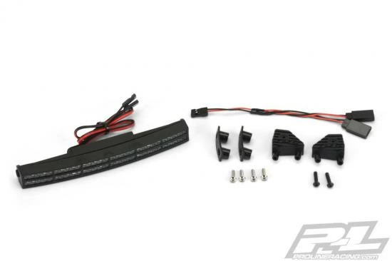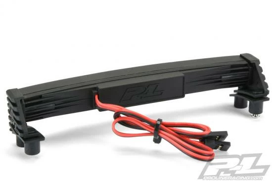 This is a Double Row 6€ Curved Light Bar for X-MAXX®. Pro-Line is proud to introduce a new Double Row 6″ Curved LED Light Bar Kit with real, working LED Lights perfect for your X-MAXX®! If you are like us, you want to use your RC car at any time of the day or night. Well now you can with the Double Row 6″ Curved Light Bar. It comes with 60 LED Light bulbs, which is 2 rows of stacked LED€™s and is pre-wired with a 12″ long cable that can plug directly into your receiver for power. The Lights are rated for 6V to 12V power, so you have the option to plug directly into a 3S Lipo power source for Super-Bright LED Light! The LED Lights are housed in a durable Curved Black Nylon housing branded with a P-L logo and includes extra-thick mounts and the hardware you need to do a custom install on your X-MAXX® or another vehicle. Night bashing is all the rage so don’t get left in the Dark! Get Pro-Line’s new 6″ Curved Super-Bright LED Light Bar Kit for your truck today!