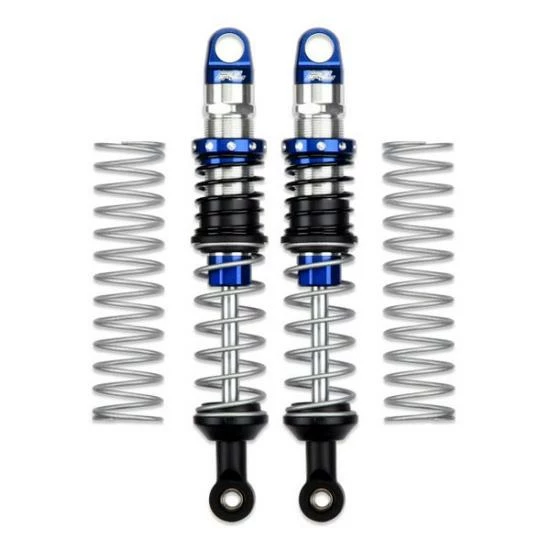 This is a pair of Pro-Spec Scaler Shocks. Pro-Line is proud to announce the next generation of RC Shock Technology with our all-new Pro-Spec Scaler Shocks! The new Shocks feature CNC machined Aluminum Shock Caps, Collars, Bodies, Bottom Caps and Hard Chrome Coated Steel Shock Shafts all made to exacting tolerances. X-Ring seals are used as the main shaft seal for smooth, low friction action and to prevent leaks. Just like Pro-Line€™s other Pro-Spec Shocks, the new Scalers are meant to stand out from the crowd with bright Chrome and Blue anodizing. From the top mounting hole to the bottom mounting hole these Pro-Spec Scaler Shocks measure out to be 90mm at full extended length and collapse down to about 64mm and they include extra 5mm longer Shock Ends to increase the shock length! These shocks are perfect for super scale rigs! Just like Pro-Line€™s extremely popular PowerStroke Shocks, the Pro-Spec Scaler Shocks come mostly pre-built (just add oil) and are designed to fit on many popular crawler vehicles. They also include Scale looking and performing Dual Rate Springs or optional Single Rate springs.