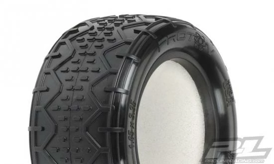 This is a pair of Proton 2.2” Buggy Race Tires. The next generation of bar tire performance is here: the Pro-Line Proton! Based off of the incredibly successful V1 Suburbs design, the Proton achieves improved performance and durability on a wider range of track surfaces. Indoor 1/10 scale Off-Road racing has taken off around the world but the traction conditions can vary wildly from loose and dusty to super wheelie traction. The V1 Suburbs performs exceptionally well at tracks with pure clay and medium to high traction and the Proton eclipses its predecessor by providing more forward grip and being easier to drive. The Proton features the same low tread found in the V1 Suburbs but the tread is thicker front to back and is more spaced out for improved performance on loose and low traction indoor surfaces. The Proton made its race debut at Round 2 of JBRL at SDRC Raceway in San Diego under extreme secrecy and went on to take the TQ and Win at the hands of Pro-Line’s Cody Turner in the premier Mod Buggy class! If you want winning performance and scientifically proven next generation tire technology, then reach for the new Pro-Line Protons!