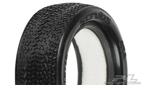 This is a pair of Scrubs 2.2″ 4WD Off-Road Buggy Front Tires. Stay in the groove with Pro-Line’s all new Scrubs 4WD front buggy tires. Designed specifically for wet/dry clay and hard packed tracks, the Pro-Line Scrubs front tire offers improved steering, handling and forward traction. The Scrubs tire features an angled bar design for tons of side bite, as well as a V-pin design which will make your buggy track straight as an arrow. The new Scrubs are offered in our M3, M4 and MC compounds to meet all your track needs. When thinking about getting a new 4WD front buggy tire, think about Scrubbing past the competition. The same Scrubs 2WD technology that is currently dominating indoor/outdoor clay and hard pack tracks on the front of 2WD buggies can now be found on Pro-Line’s new Scrubs 4WD front!