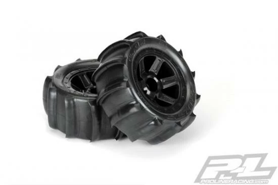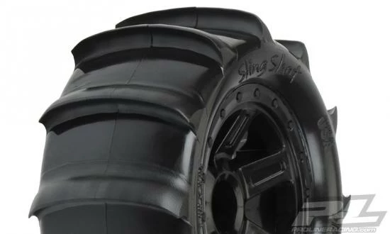 This is a pair of pre-mounted Sling Shot 2.2″ Paddle Tires. The newest form of fun is here with the release of the Sling Shot 2.2″ paddle tire mounted to Desperado wheels for mini E-REVO® trucks! The Sling Shot provides hours of fun in the sand, snow or even in the occasional mud pit. The 12 paddle design ensures maximum performance due to the true scoop design coupled with low roll outer sidewalls. The Sling Shot comes complete with foam inserts and big Pro-Line fun!