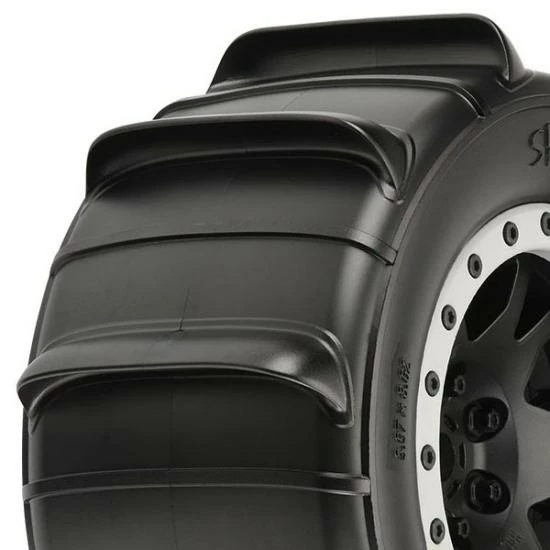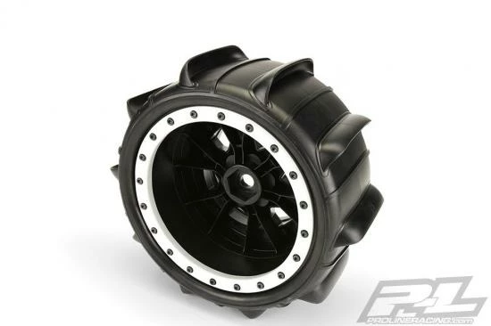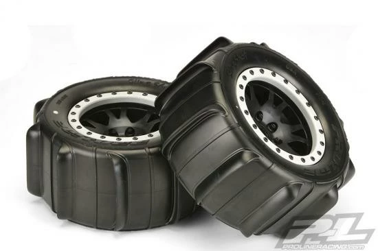 This is a pair of pre-mounted Sling Shot Paddle tires for X-MAXX®. Pro-Line is ready to unleash the Sling Shot paddle tire for X-MAXX® owners! Pro-Line Sling Shot tires are known for having an incredible scale paddle tire appearance combined with unbelievable Sand and Snow performance! These tires have been developed from the ground up for extreme X-MAXX® punishment with an all-new ultra-durable compound that prevents tire ballooning even at high speeds. The Sling Shot 4.3″ tire features Pro-Line’s ground breaking proprietary Pro-Loc Technology that creates an ultra-secure bond to Pro-Line’s Impulse Pro-Loc X-MAXX® wheels while still being removable when required. The reinforced Tire bead fits into a uniquely shaped channel on the wheel and the bead-loc screws actually pass through the tire rubber before being pinched by the outer bead-loc ring to create the maximum possible mounting security. This technology debuted on the Badlands MX43 Pro-Loc Tires and has proven to be extremely popular for the X-MAXX® fans.