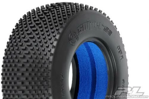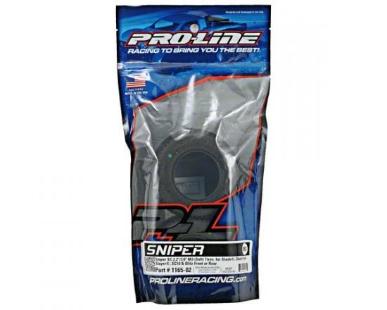 This is a pair of Pro-Line Sniper SC tires. Honey, I blew up the Hole Shot! The Sniper uses the same design philosophy and technology as the Hole Shot, but scaled up to work on looser and dustier track conditions. After initial testing, Pro-Line team drivers Ryan Cavalieri and Travis Amezcua are already sold on the tire saying that the Sniper offers awesome forward traction and side bite on a variety of track conditions. The bigger pins also provide longer wear, giving you lasting traction through long A-mains.Â