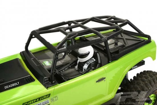 This is a Soft-Top Scale Accessory for the SCX10 Deadbolt. Pro-Line has a hot new scale accessory that will make your rig stand out from the rest: the TimberLine Soft-Top for the SCX10 Deadbolt! Made from Black Nylon with Clear Vinyl Windows, the TimberLine Soft-Top will fit perfectly on the stock deadbolt Cage with the included Velcro® mounts. We recommend attaching the included Velcro® strips to the Cage using Hot Glue or Pro-Line Tire Glue. Just like a full-size soft-top, Pro-Line’s TimberLine Soft-Top captures the details with a rear window, two side windows and a full length soft roof to protect your important cargo! A small, sewn in P-L tag adorns the back so you know you are getting real Pro-Line quality. For the highest quality and most unique scale items, look no further than Pro-Line! Get your own TimberLine Soft-Top today!