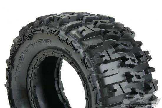 This is a pair of Trencher 4.3″ Pro-Loc Tires. Pro-Line is ready to unleash the incredibly popular Trencher tread super-sized for your X-MAXX®! Pro-Line’s world class development team spent several months of research, development and testing to ensure that the Trencher 4.3″ tire will perform above and beyond your expectations in any off-road condition you can dream up. Whether it is loose or hard-packed dirt, sand, snow, grass or gravel the Trencher tire is up to the task. The Trencher 4.3″ is Wider and Taller than the popular Badlands 4.3″ for more aggressive looks and performance and comes in a Super Soft compound for incredible grip!