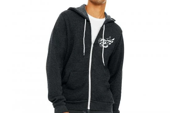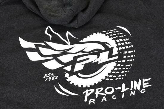This is a Pro-Line Wings Gray Zip Up Hoodie. Introducing the new Pro-Line Wings Black T-Shirt! This ultra-soft ring spun cotton/poly blend sweatshirt features a moto-style design with winged rendition of our iconic Hole Shot tire and contrasting white zipper and drawstrings. This special logo is featured across the center of the back and a small version is on the front left chest area. Get your new Pro-Line Wings Hoodie now!